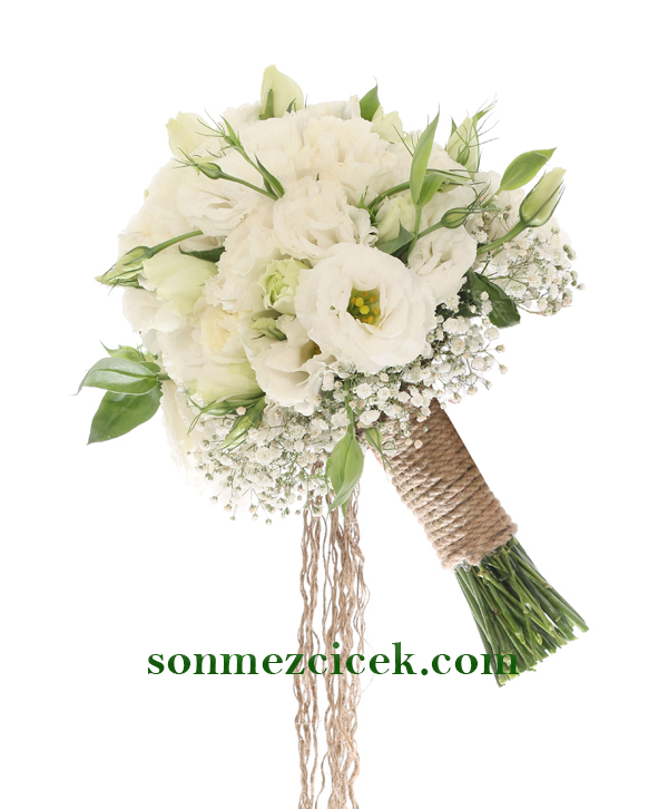 Beyaz lisiantus çiçeklerle hazırlanmış özel tasarım gelin buketi .