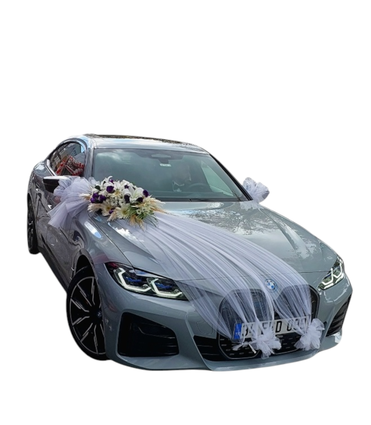 Modern dokunuşlarla tasarlanan bu gelin arabası süslemesi, beyaz tüller ve mor-beyaz tonlardaki çiçeklerle göz alıcı bir zarafet sunuyor. Kaput üzerine çapraz şekilde serilen uçuşan tül, romantizmi simgelerken; papatya, gerbera ve mor lisyantüs çiçekleriyle oluşturulan aranjman asil ve etkileyici bir görünüm kazandırıyor.