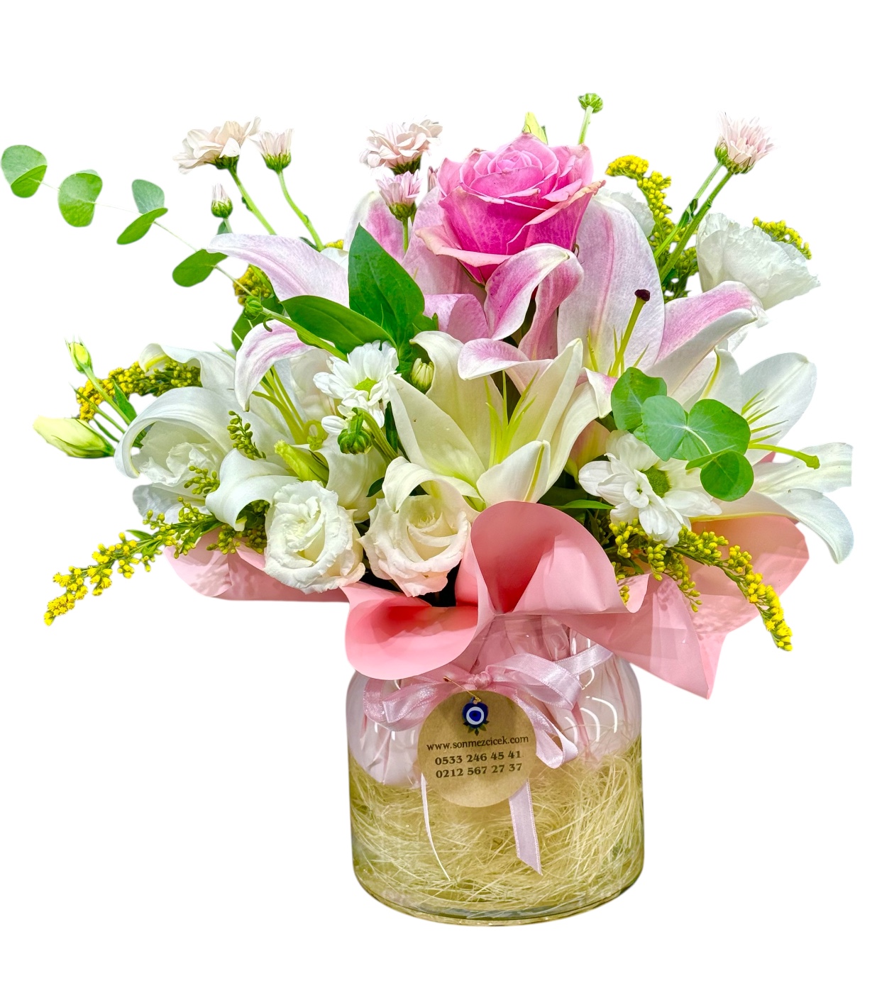 Cam vazoda pembe gül, lilyum ve beyaz lisyantus çiçeklerinden oluşan bu zarif aranjman;