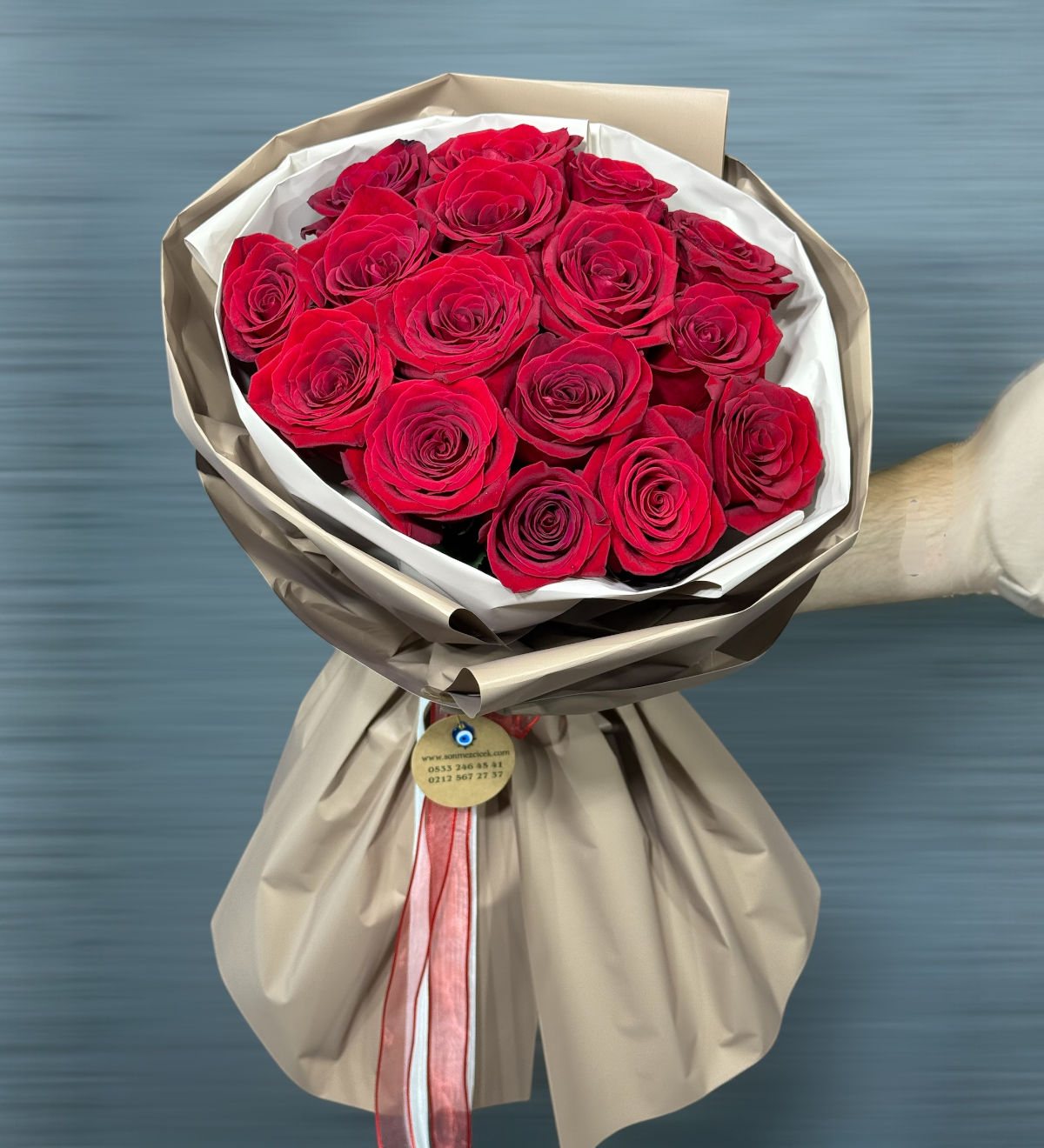 20 adet taptaze kırmızı gül, özenle hazırlanmış şık buket tasarımı ile unutulmaz bir hediye.