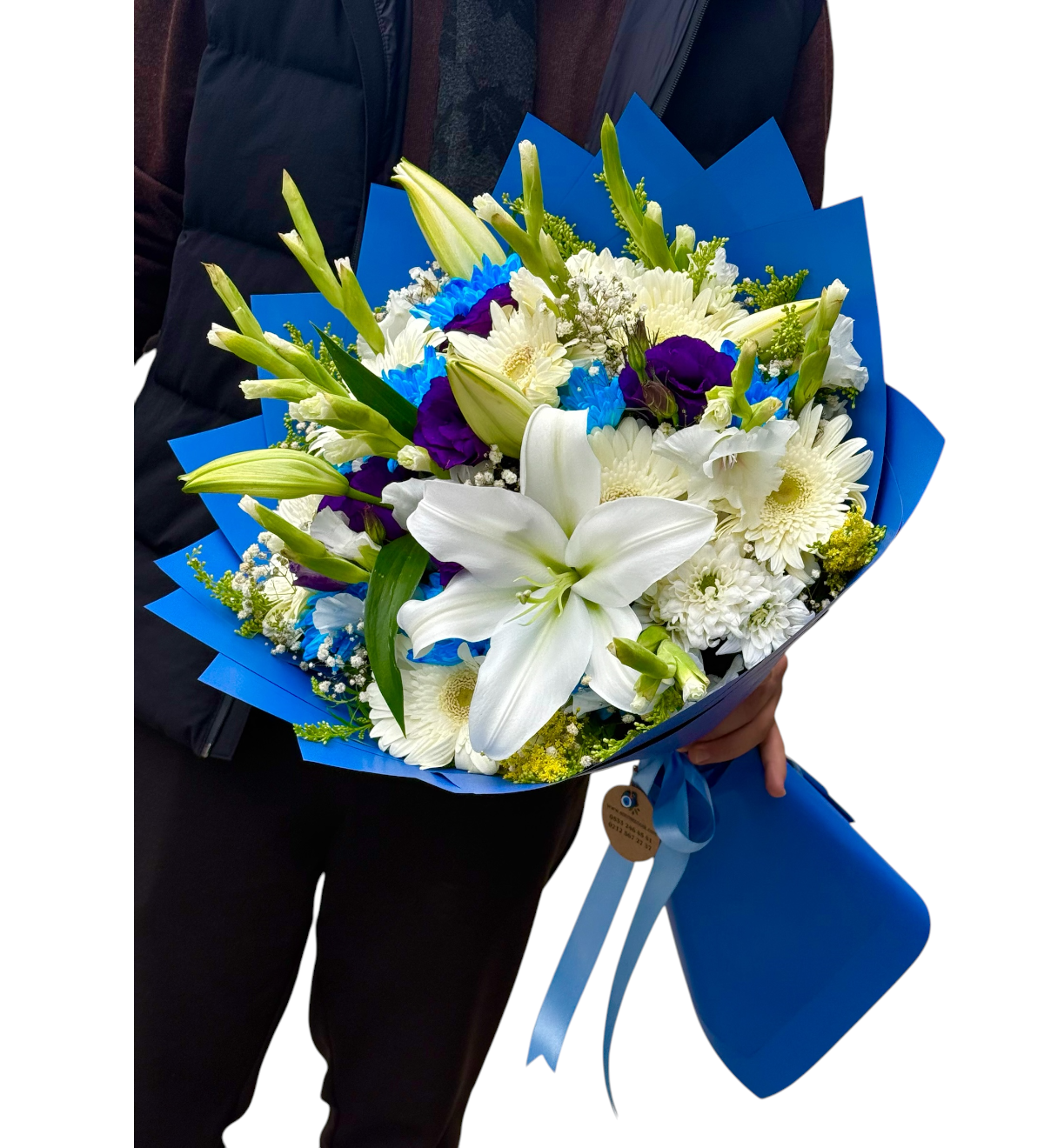 Buket, mavi ve beyaz tonlarının hakim olduğu modern ve ferah bir tasarımdır. Şık mavi ambalaj ile hazırlanmış bu özel çalışma; beyaz lilyum, beyaz gerbera, mavi krizantem, lisyantus, cipso ve tamamlayıcı yeşillikler ile tasarlanmıştır. Tasarımda kullanılan tüm çiçekler birinci kalite olup, taze kesim olarak hazırlanır. Buket yüksekliği 55-60 cm aralığındadır. Su değişimi desteklenerek çiçeklerin uzun süre canlı kalması sağlanır. Hem özel günlerde hem de içten bir jest için şık, modern ve göz alıcı bir seçenektir.