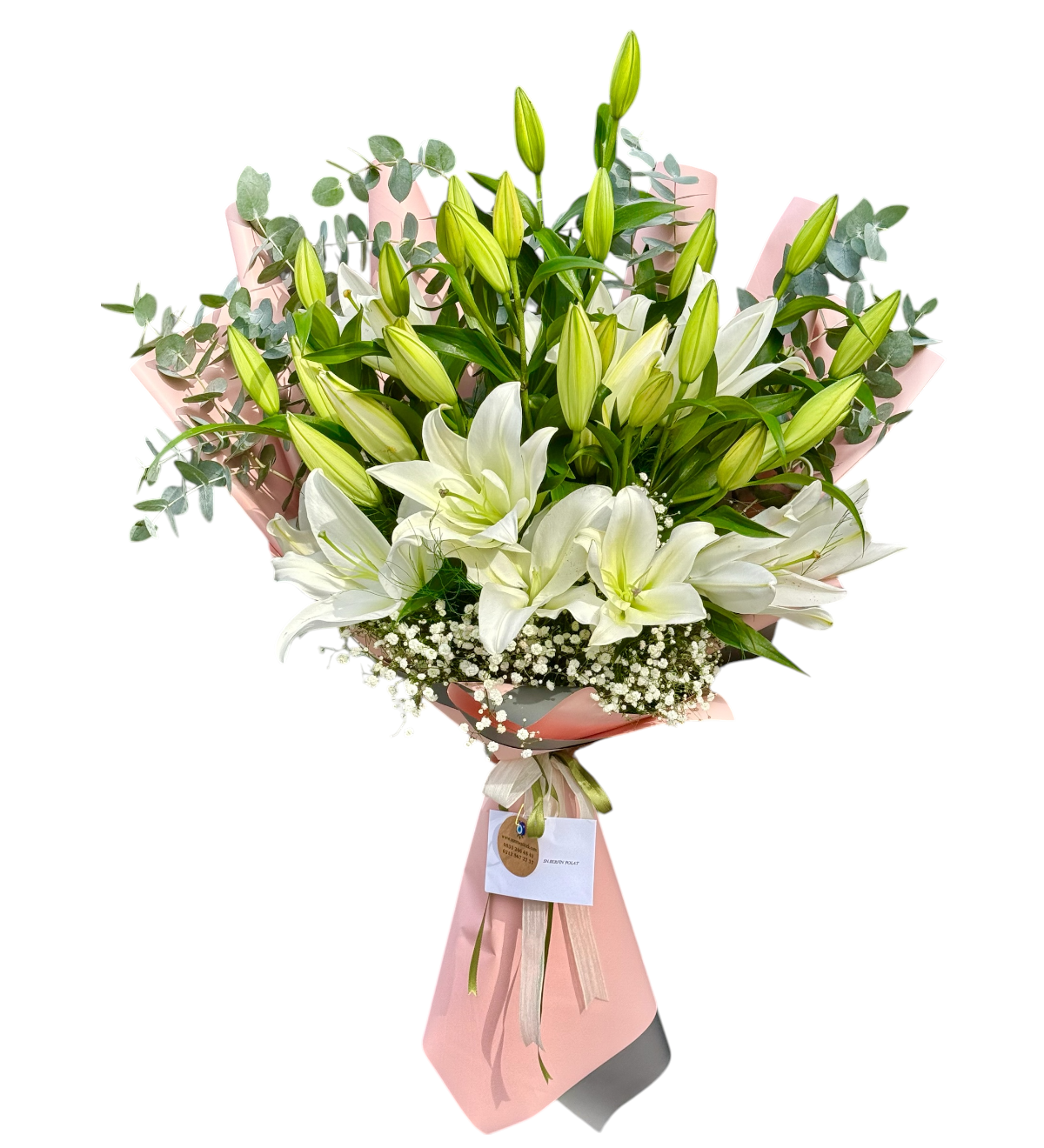 Zarafetin ve Saflığın En Güzel Hali 6 dal Kazablanka lilyumdan oluşan bu özel buket, beyazın asil duruşunu ve lilyumun büyüleyici kokusunu bir araya getirir. Gösterişli çiçek yapısı ve ferah görünümüyle hem klasik hem de modern zevklere hitap eden şık bir tasarımdır.