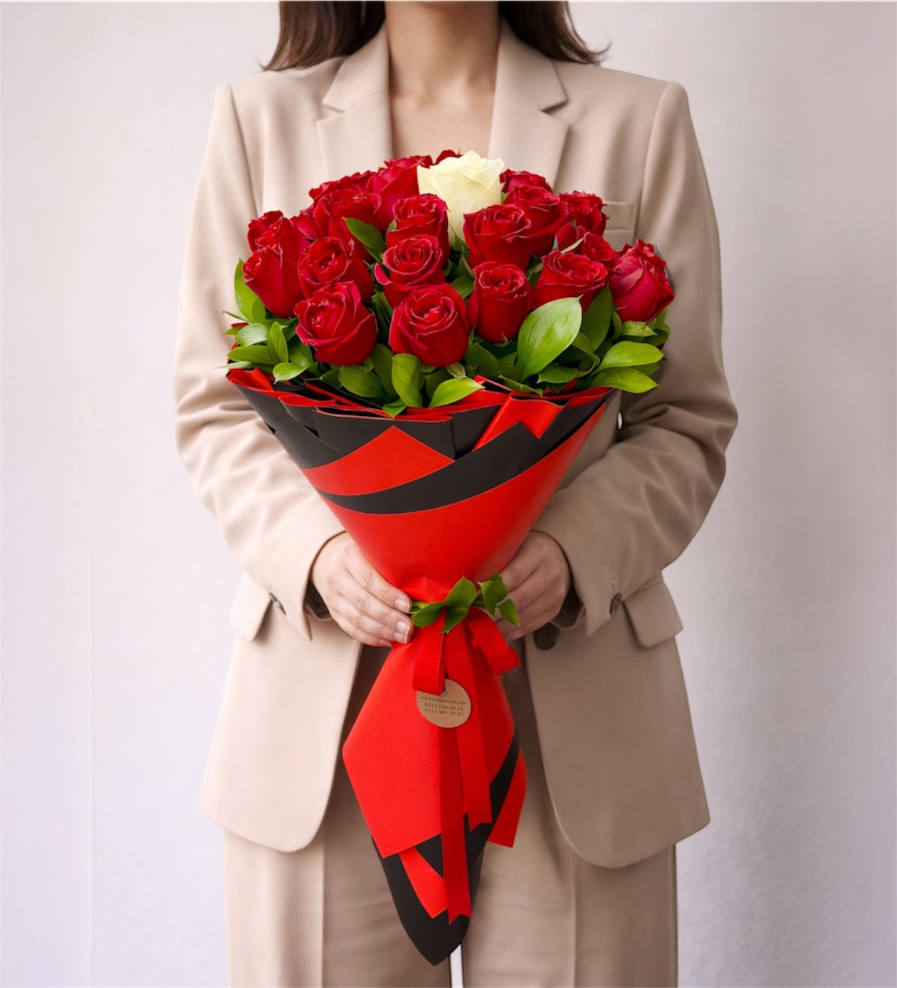 20 adet taze kırmızı gülden hazırlanan bu şık buket, sevginizi en güçlü şekilde ifade etmenin en özel yoludur. Kırmızı güllerin asaleti, modern ambalaj ve canlı yeşil yapraklarla birleşerek etkileyici bir görünüm sunar. Sevgiliye, eşe ve özel günlere anlam katar.