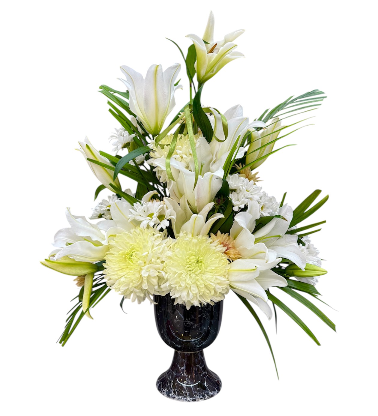 Anlamı Beyaz lilyum saflığı ve saygıyı Beyaz krizantem ise huzur ve içtenliği simgeler Bu aranjman özellikle resmi ve anlamlı anlar için zarif bir tercihtir.