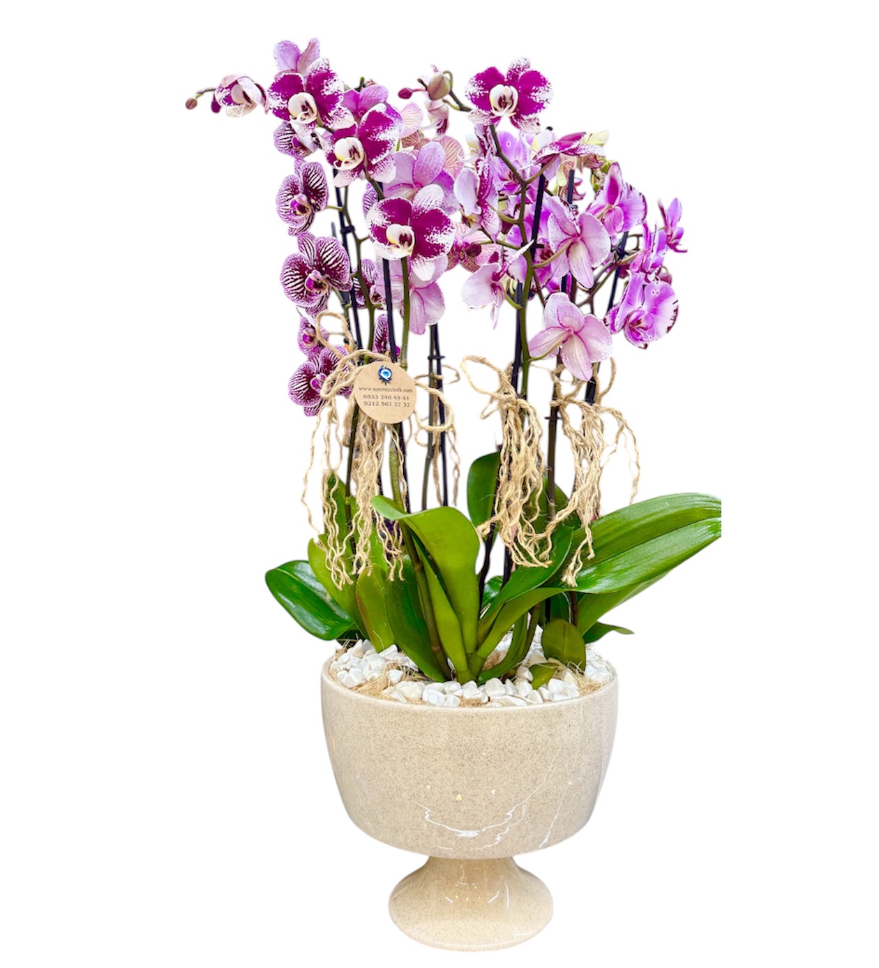 Ürün Özellikleri Ayaklı şık seramik saksı içerisinde özenle hazırlanmış sekiz dal renkli orkide Canlı mor pembe tonlarıyla dikkat çeken premium orkide seçimi Dolgun çiçek yapısı ile gösterişli ve lüks görünüm Dekoratif beyaz taş süsleme ve doğal bağ detaylarıyla özel tasarım