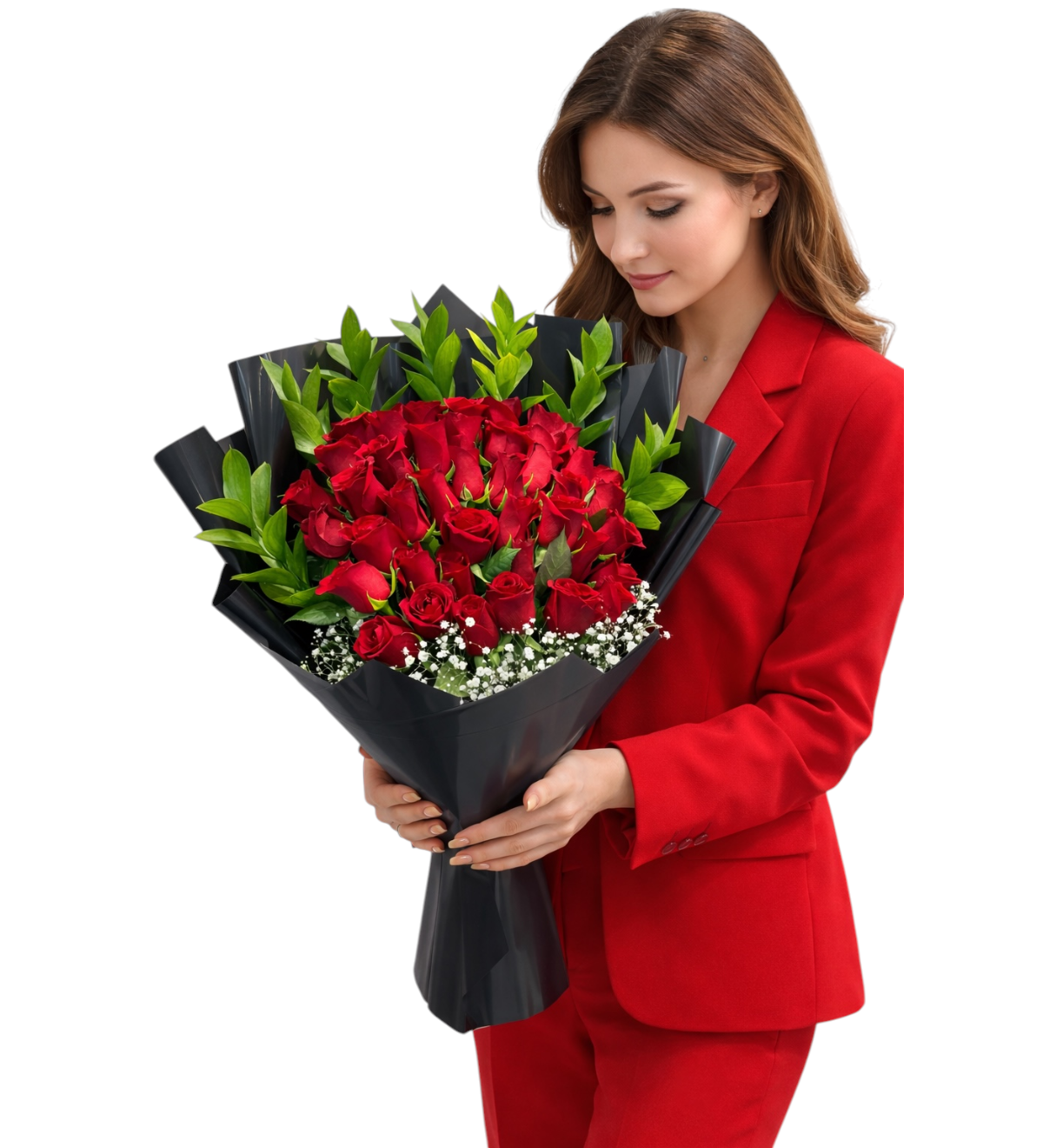 Premium Ve Gösterişli Tasarım Siyah ambalaj ve yeşil detaylarla hazırlanan buket kırmızı güllerin ihtişamını ön plana çıkarır