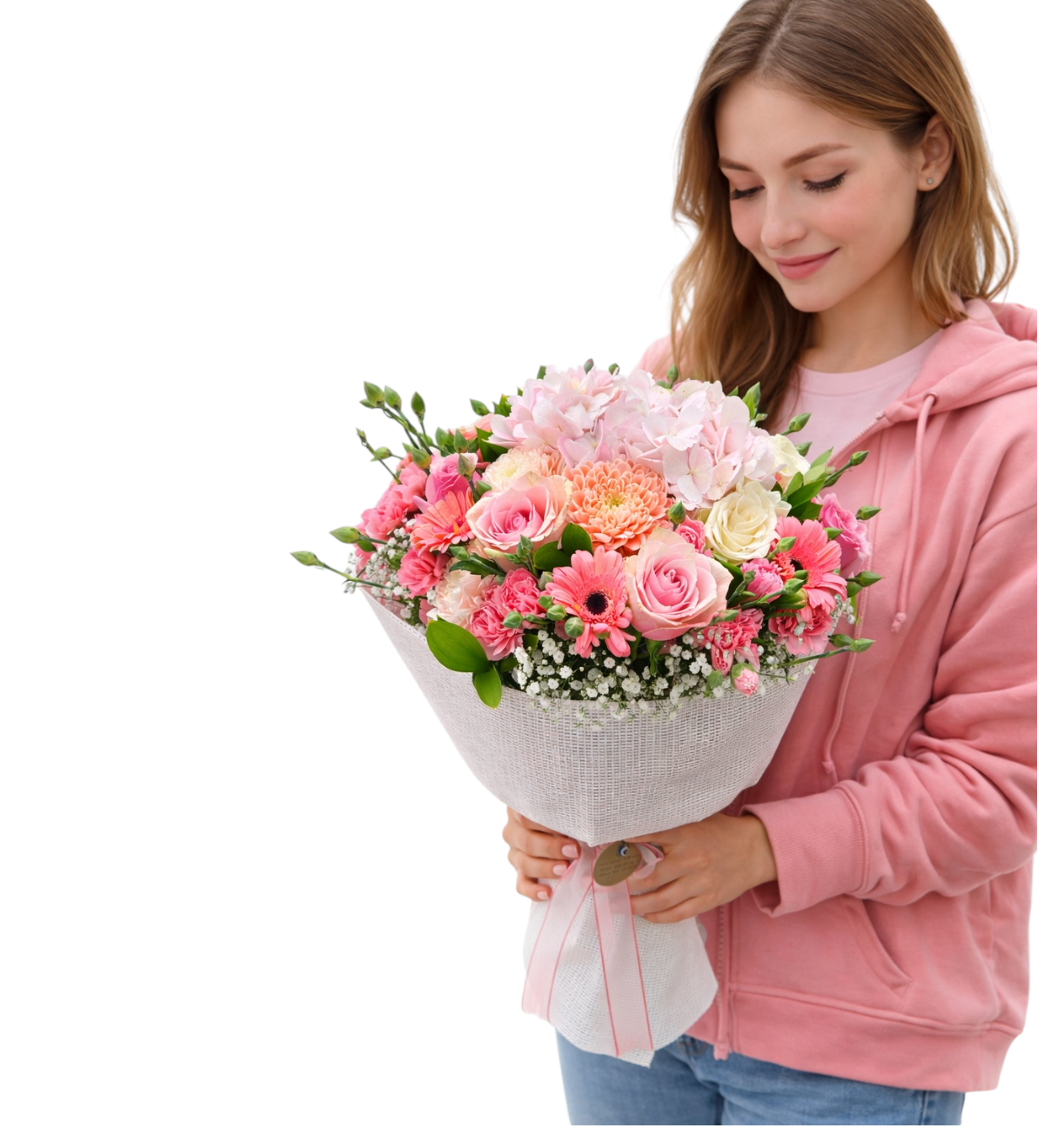 Ürün Özellikleri : Pembe tonlarda gül, gerbera ve mevsim çiçekleri Dolgun ve gösterişli buket tasarımı Şık ve modern beyaz ambalaj Yaklaşık buket boyu 55-60 cm